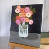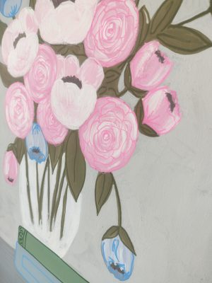This painting is a charming and stylized floral still life with a soft, pastel color palette.