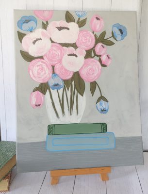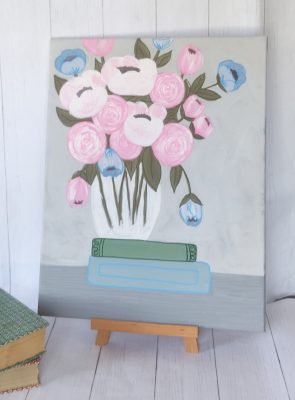 This painting is a charming and stylized floral still life with a soft, pastel color palette.
