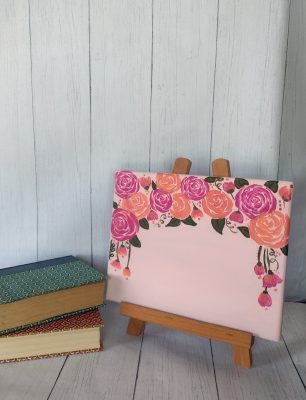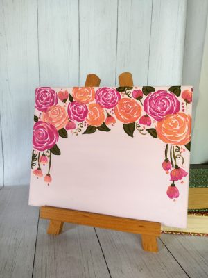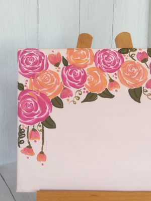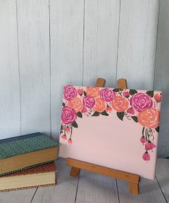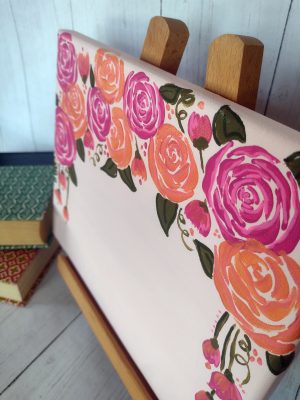 This painting of a bouquet of roses in shades of peach and pink evokes a light, cozy and uplifting atmosphere. With plenty of space for a Bible verse or other phrase. I can’t wait to customize this painting just for you. Painted with acrylic paint on a stretched 8×10 canvas and sealed with varnish to protect it from the elements, this painting is ready for you to display.